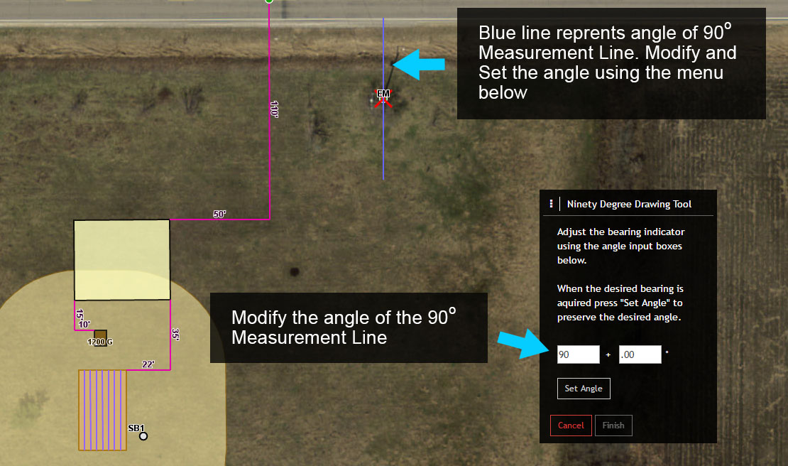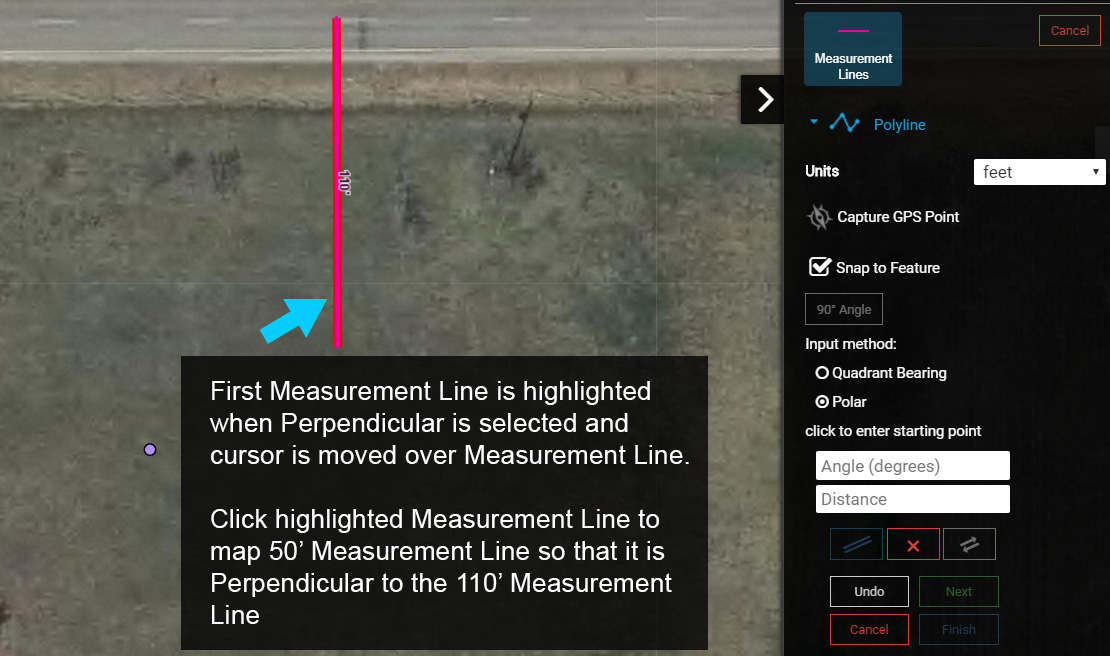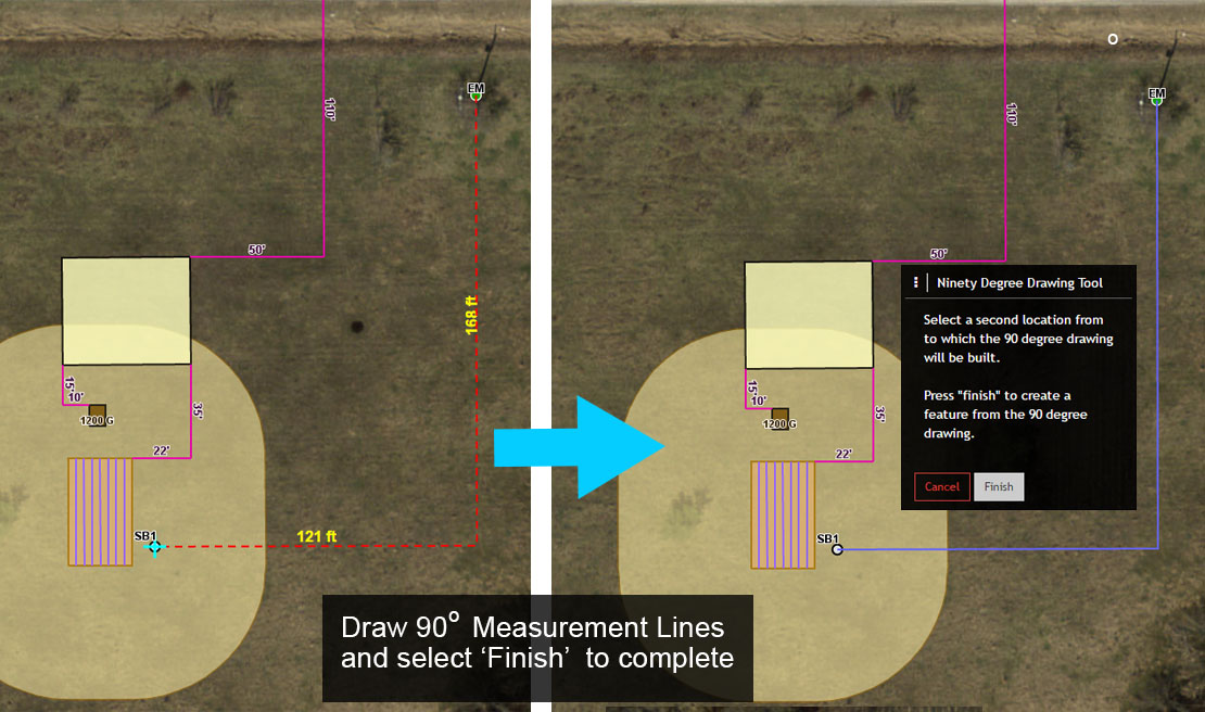 7. Select ‘Finish’ from the 90 Degree Drawing Tool menu to finish mapping the two new Measurement Lines.