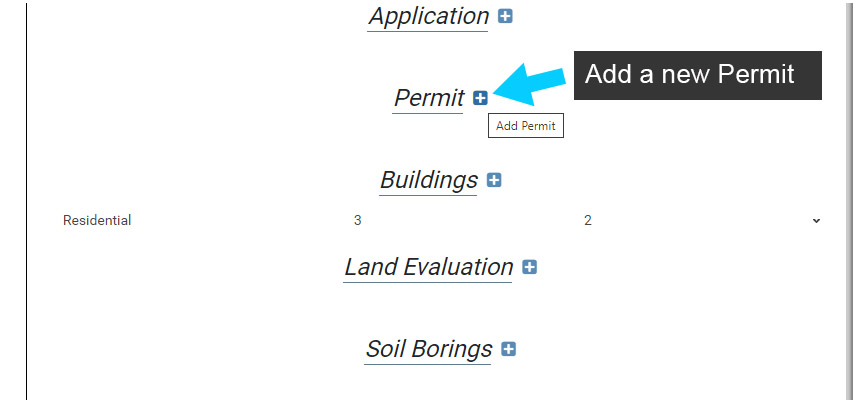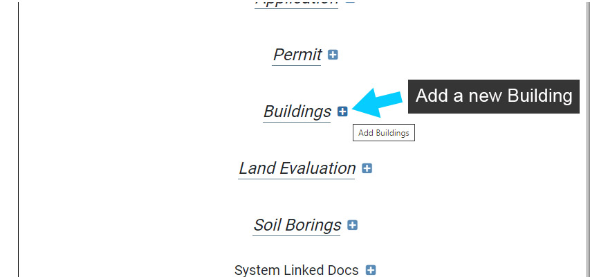 Next to the name each mappable feature (Buildings, Soil Borings in image) and table records (Application, Permit, Land Evaluation in image) is a blue (+) button. This button is used to add the corresponding mappable feature or table record to the System.