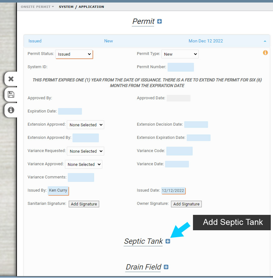 4. Enter information for the new Permit below and note that the Septic Tank and Drainfield can now be added under the Permit.
