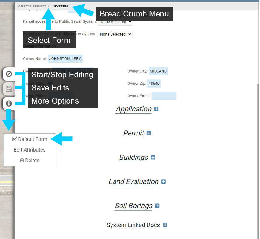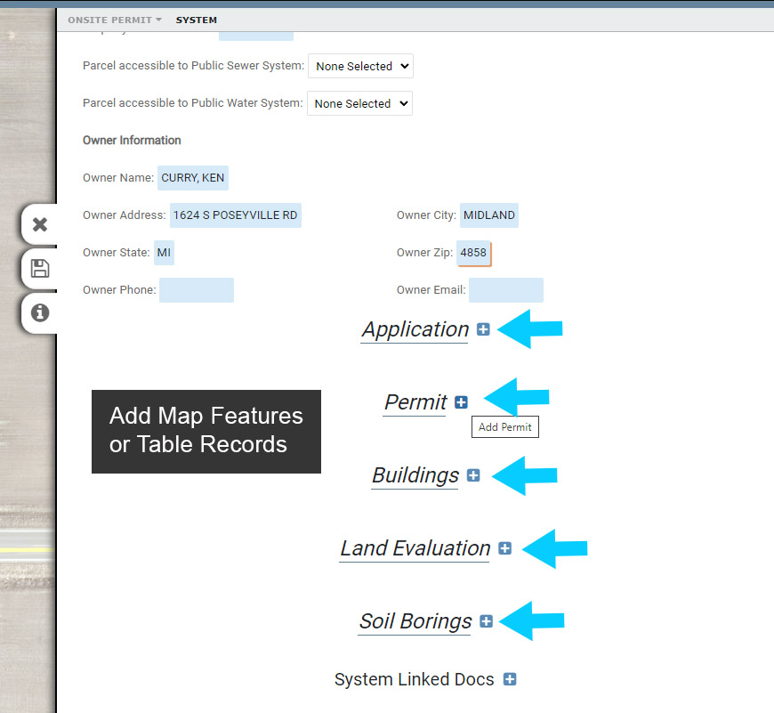 Both mappable features and table records can be added to a System a Form, in this example the Onsite Permit Form (or System Information Form if you are not using Permitting).