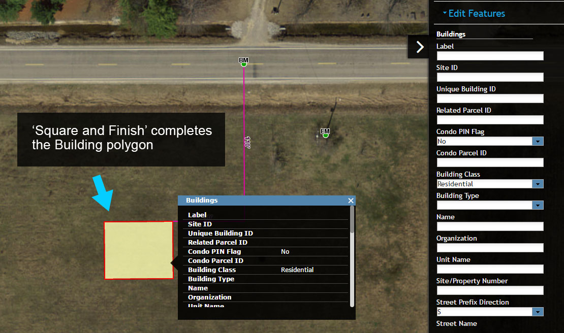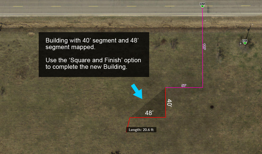 14. Now that there are two line segments of the Building mapped, you can use a shortcut to complete the new Building. Select the ‘Square and Finish’ option to complete the Building.