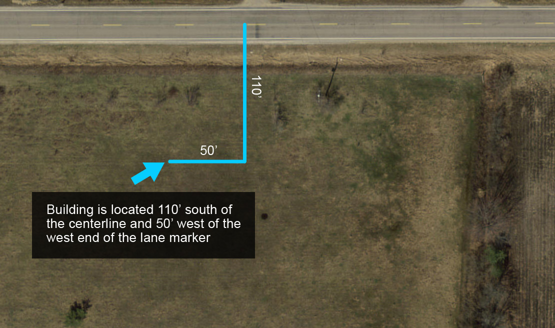 To get started with the example Site Plan we make field measurements and find the distance from the road centerline to the buildings northeast corner is 110′ south of the centerline and 50′ west of the west end of an identifiable lane marker in the road.
