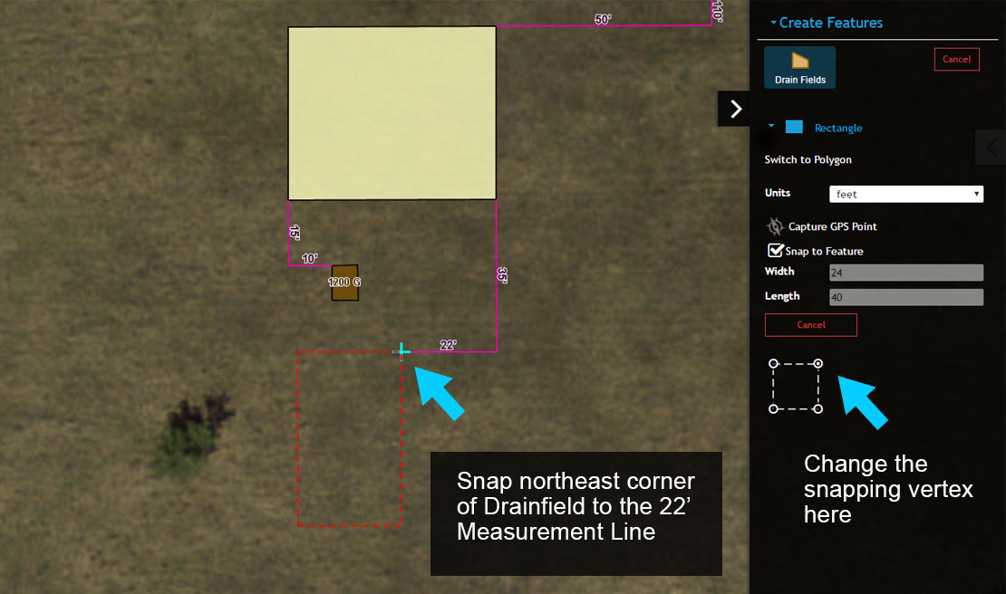 2. Map the Drain Field so its northeast corner is ‘snapped’ to the west end of the 22′ Measurement Line. Note that you will need to change the snapping vertex to accomplish this task.