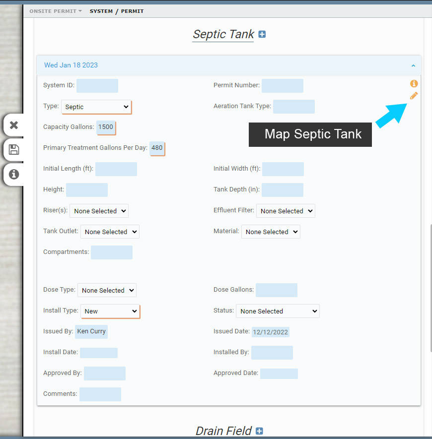 1. Following the same process used to add the Septic Tank, use the Permit Form to add a new Drainfield (System Information Form if not using Permitting).