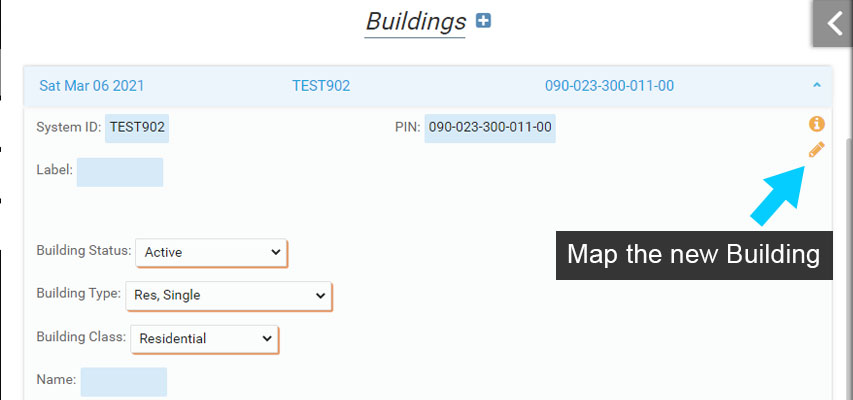 15. Once the Building is mapped, the Form will open to display the Building information. Note that the ‘Add to map’ button (pencil icon) is no longer present because the Building has been mapped.
