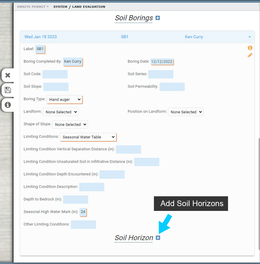 Soil Borings include general information and Soil Horizon information. When you add a Soil Boring, the Form displayed initially is used to enter Soil Boring information, such as who completed the boring, the date, seasonal high water mark and more.