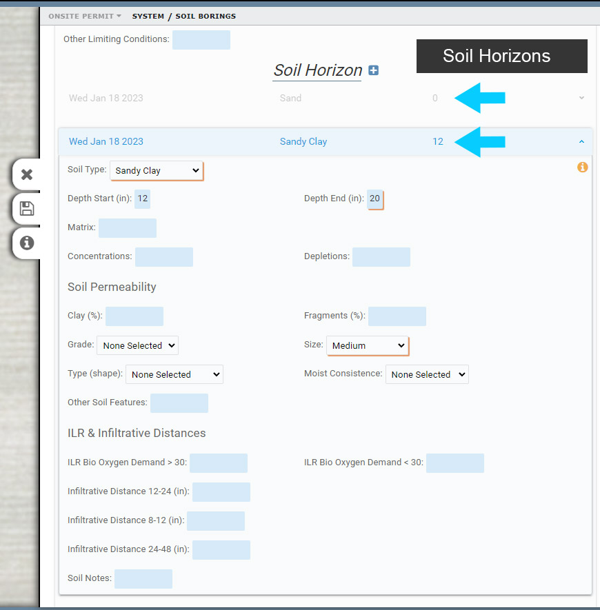 You can add as many Soil Borings to a System, and multiple Soil Horizons for a Soil Boring. Soil Horizons will be stacked in the Form when there is more than one. To view a collapsed Soil Horizon in a Form, select it and it will expand to display its contents.