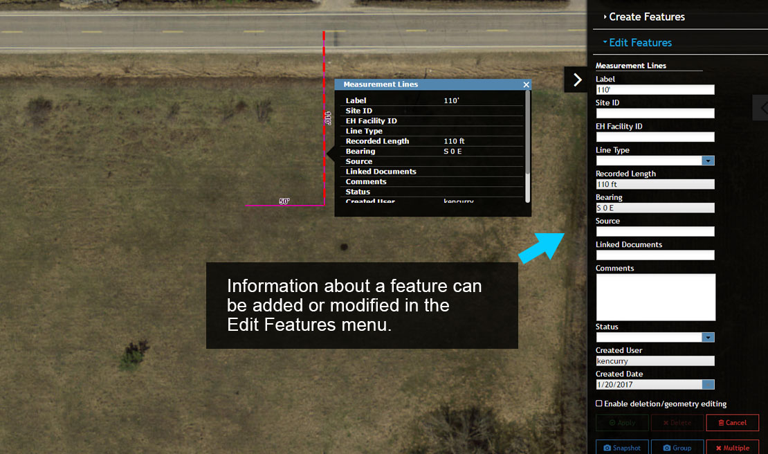 11. Using the Pan tool select each Measurement Line feature to display the corresponding Information Window. Notice that the Edit Features menu also changes to display the attributes of the selected Measurement Line feature (reference the Recorded Length input box).