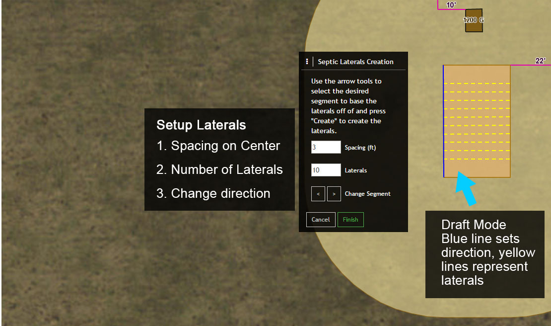 4. Once the Drain Field is selected the default settings of the number of laterals, on center spacing and orientation or side of origin will be displayed both on the map and in the ‘Septic Laterals Creation’ menu.