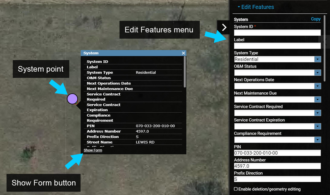2. Next, select the System point on the map and select ‘Show Form’ to open the Onsite Permit Form (System Information Form if not using Permitting).