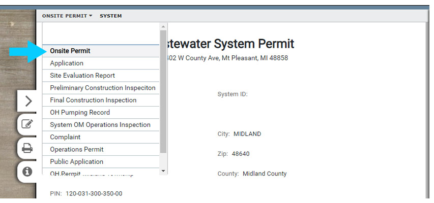 With the Form open, use the drop down menu to select the System Form that also contains a Permit (Onsite Permit in the image).