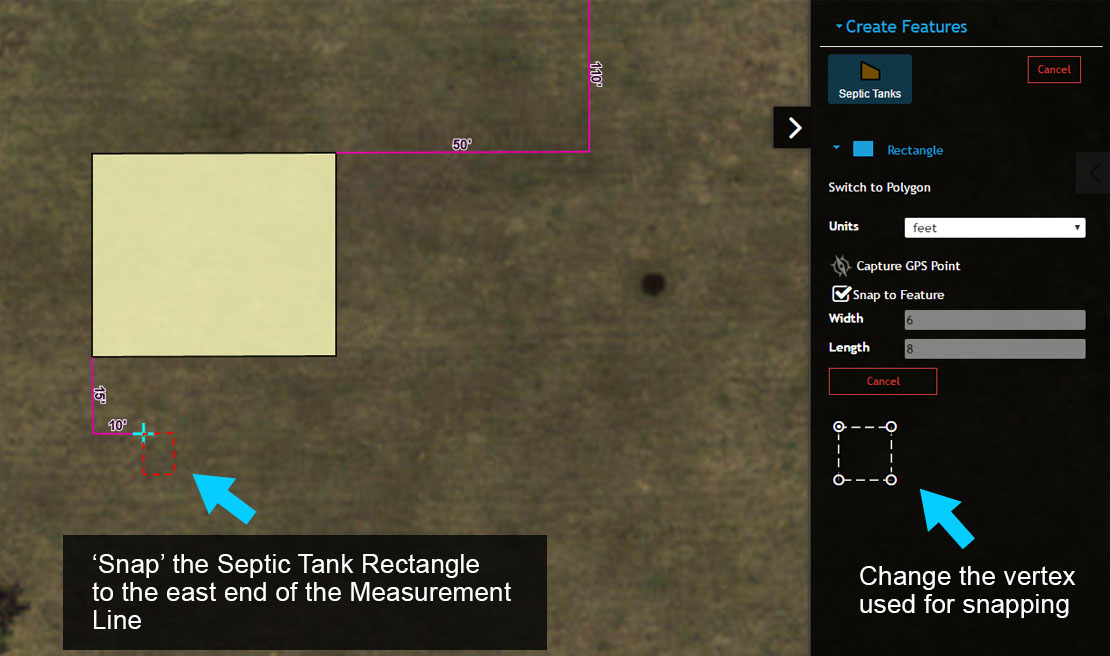 9. The Septic Tank needs to be mapped at the east end of the 10′ Measurement Line, so toggle snapping on and check the Rectangle Snapping reference (white dashed rectangle in menu) to see what vertex on the Rectangle will be used for snapping.