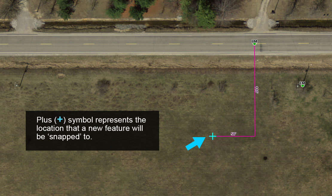 3. With the Snap to Feature option enabled, move your cursor to the start of the 110′ Measurement Line. A blue plus (+) will appear, which represents the location on the Measurement Line that the new Benchmark will be ‘snapped’ to. Click to map the Benchmark.