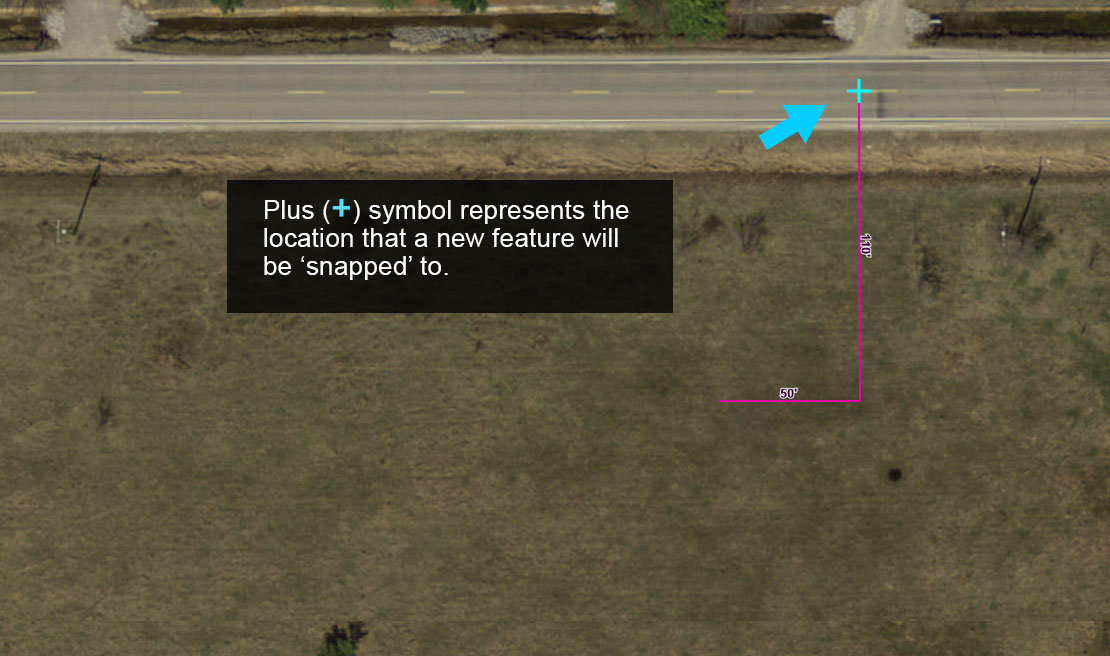 7. Move the cursor to the west end of the 50′ Measurement Line where a blue plus (+) will appear on the Measurement Line. The blue plus (+) is the location on the Measurement Line that the new Building will be ‘snapped’ to.