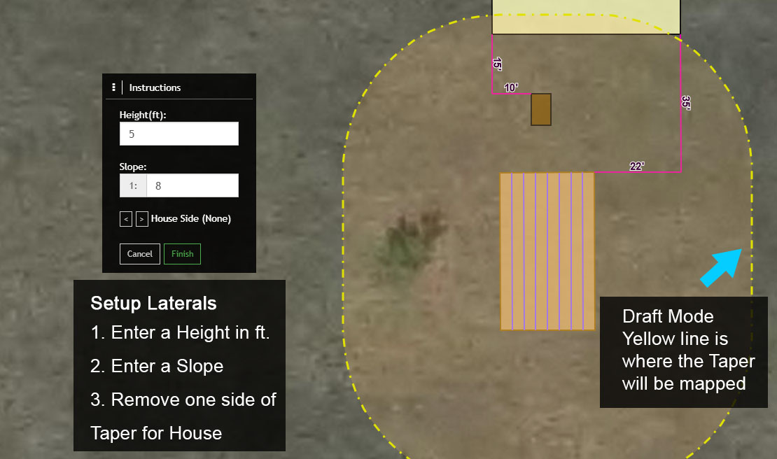 4. Once the Drain Field is selected the default settings for Height and Slope will be displayed in the Instructions menu. There is also an option (House Side) to modify the Taper so that one side of the slope is not mapped.